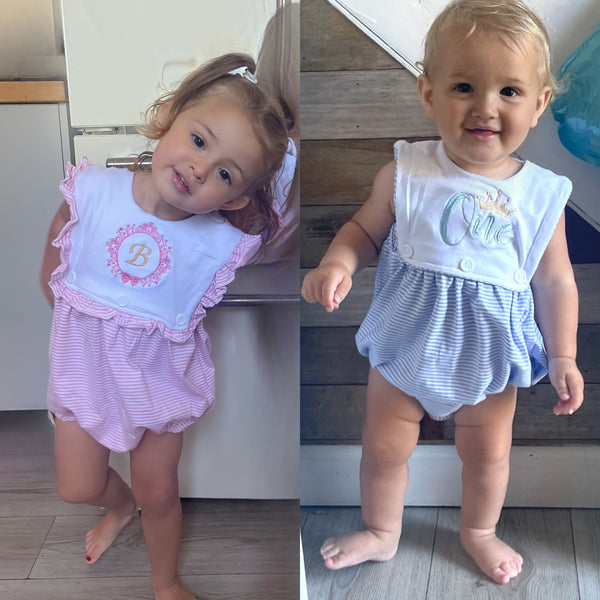 A stunning cotton romper in pink for the girls or blue for your little boy; perfect for all of your embroidery needs. Choose from a simple name or from some mini designs to make your item unique. 🤍💛💗💜💙